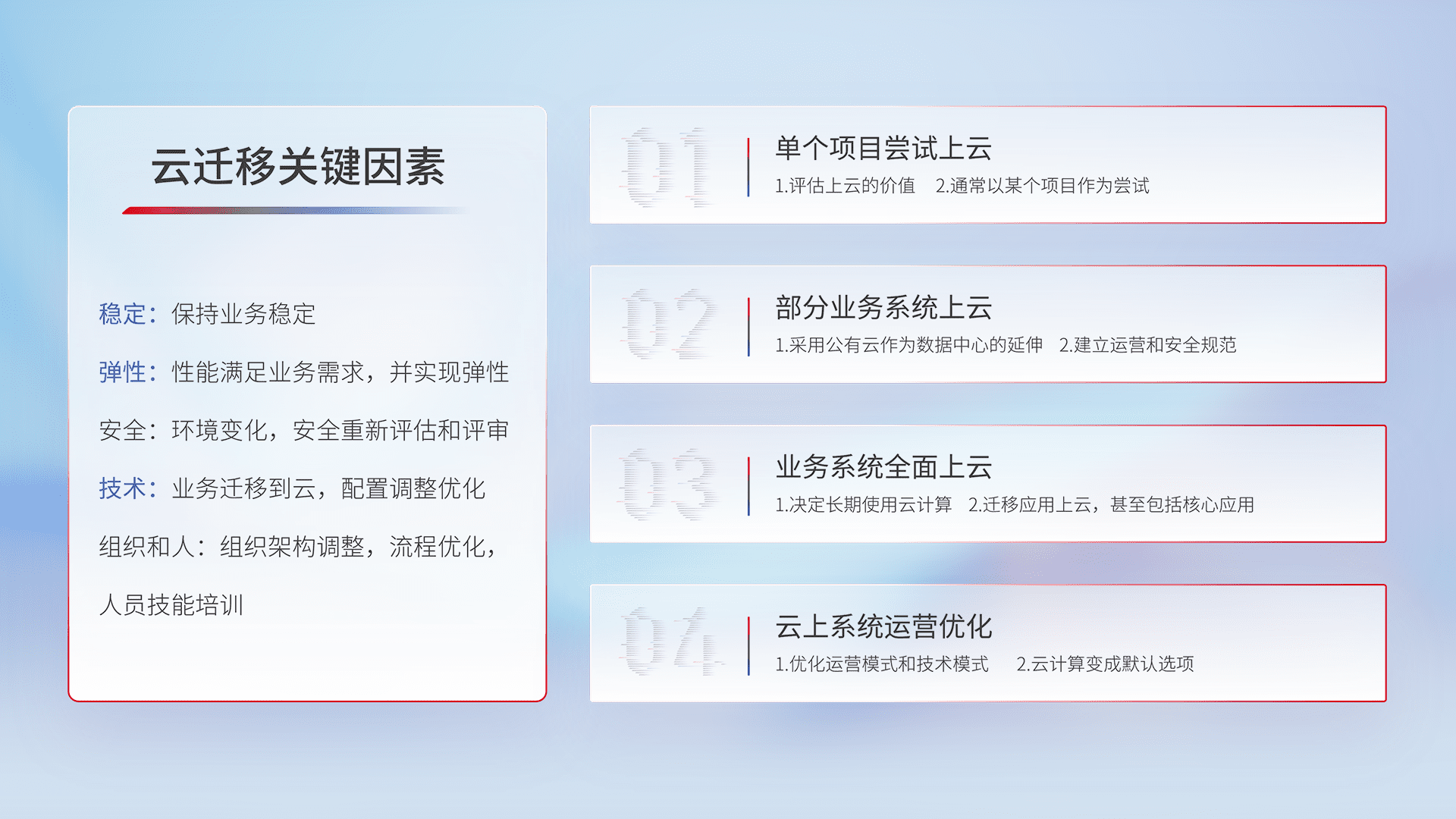 结合实际业务,,,从规划设计、、云平台选型、、、、云原生改造、、、数据迁移、、、、集成交付,,,,迁移全过程为客户识别最佳上云路径,,做好风险识别管理,,设计网络架构、、身份权限、、、安全审计合规、、、操作审计、、日志审计、、、、监控告警策略、、多站点容灾设计等,,对云上基础设施进行整体规划,,,提升IT治理水平,,以满足弹性、、、高可用、、、、高性能的需求。。。