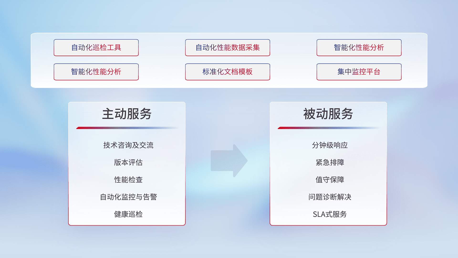 智能化工具和标准化文档,,,,保障服务质量,,,,提供主动服务(包含技术咨询、、、版本评估、、、性能检查、、、、自动化监控与告警、、、、健康巡检)和被动服务包含(分钟级响应、、、紧急排障、、、值守保障、、问题诊断解决、、SLA服务)。。。。