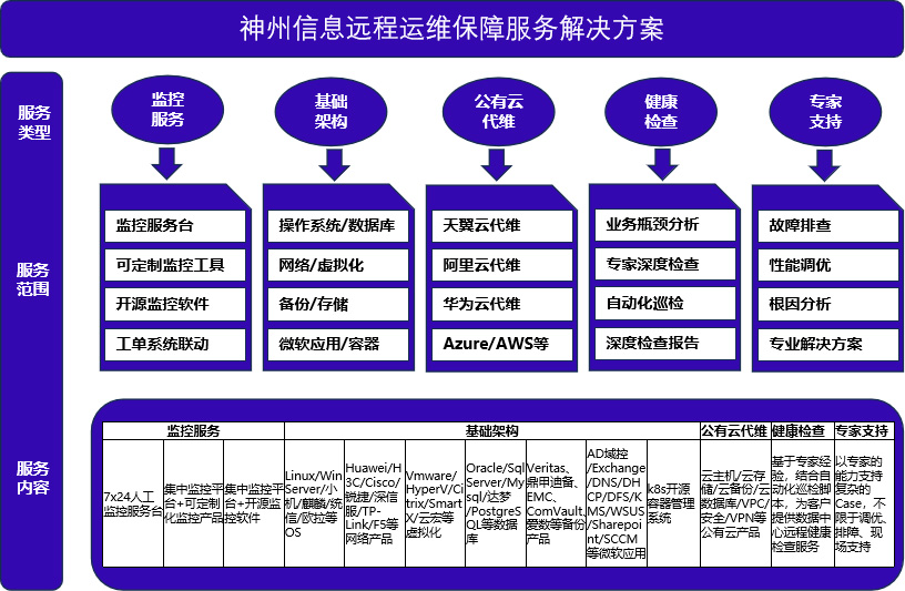 依托7×24小时智能监控中心、、、、专业化运维管理平台及资深级技术专家团队,,构建三位一体的远程运维服务体系,,,,提供包括对公有云、、私有云、、、机房、、、、网络、、服务器、、、操作系统、、、存储、、备份、、、、数据库、、中间件、、、应用、、、安全等ICT基础设施的远程保障服务。。。为客户数字化转型、、人工智能、、、、云计算、、物联网、、、区块链、、、数字资产等前沿技术领域保驾护航,,,,驱动客户数字创新进程。。。。